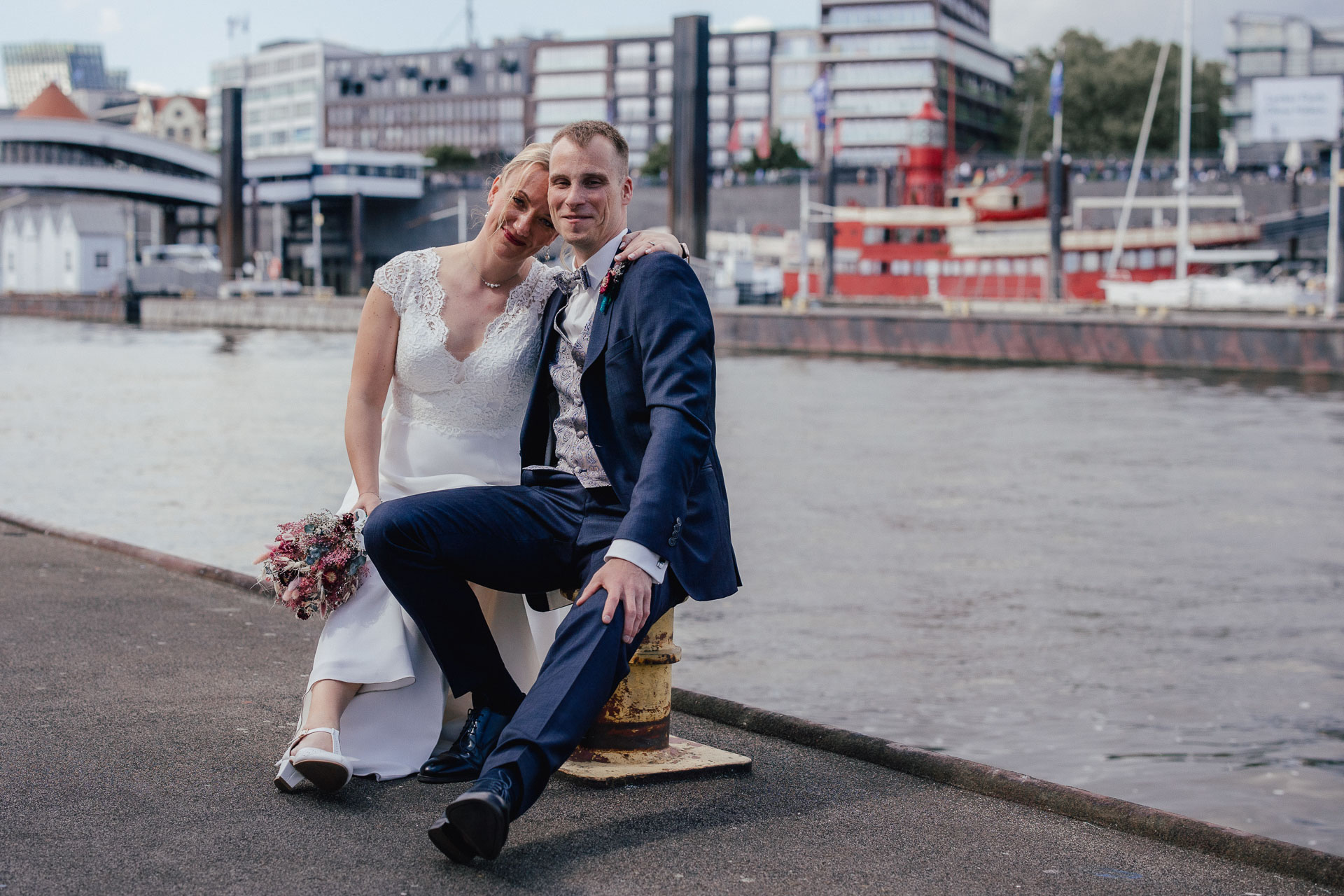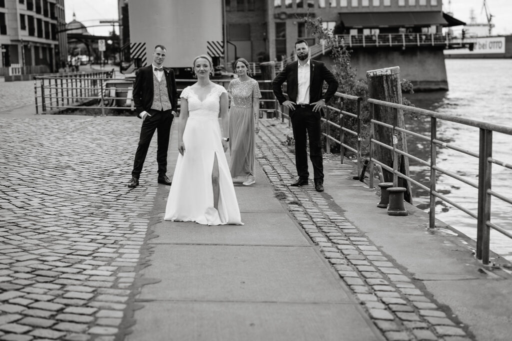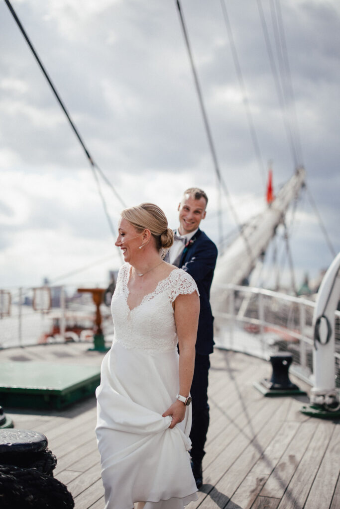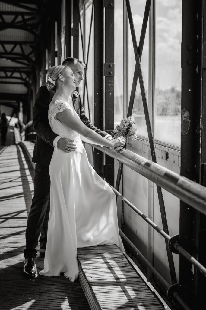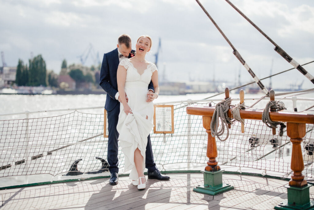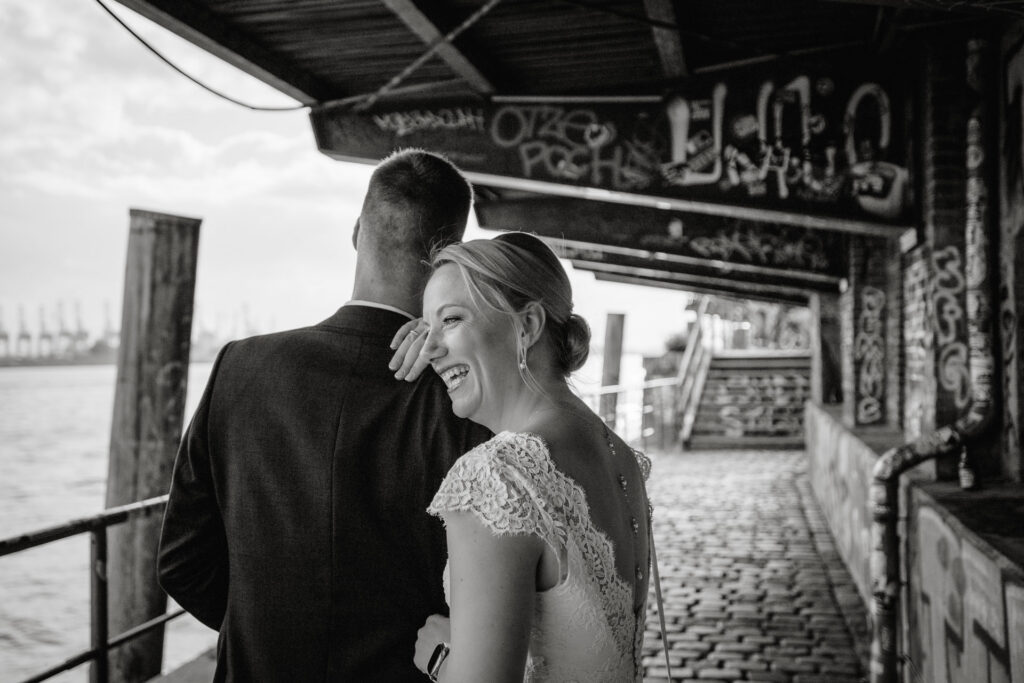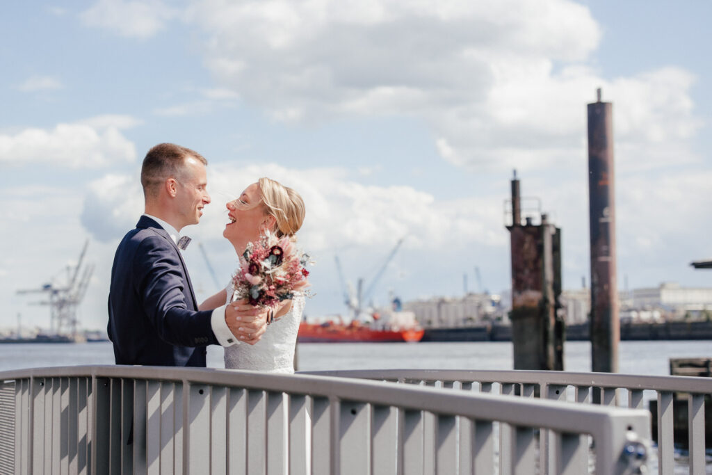Direkt nach der standesamtlichen Trauung haben wir uns am Hamburger Hafen getroffen. Anna und Sven sind ein Paar, das mit Leichtigkeit durchs Leben geht – humorvoll, ausgelassen und spürbar verbunden. Genau das machte den Tag so besonders: nichts inszeniert, alles echt.
