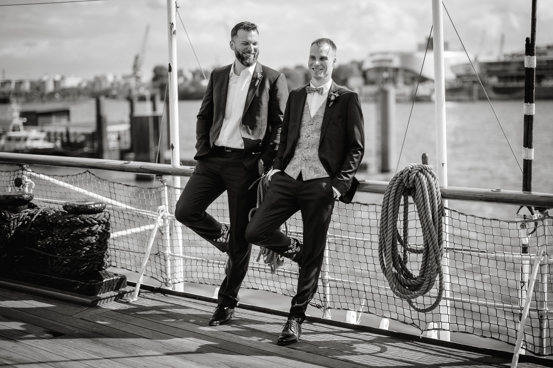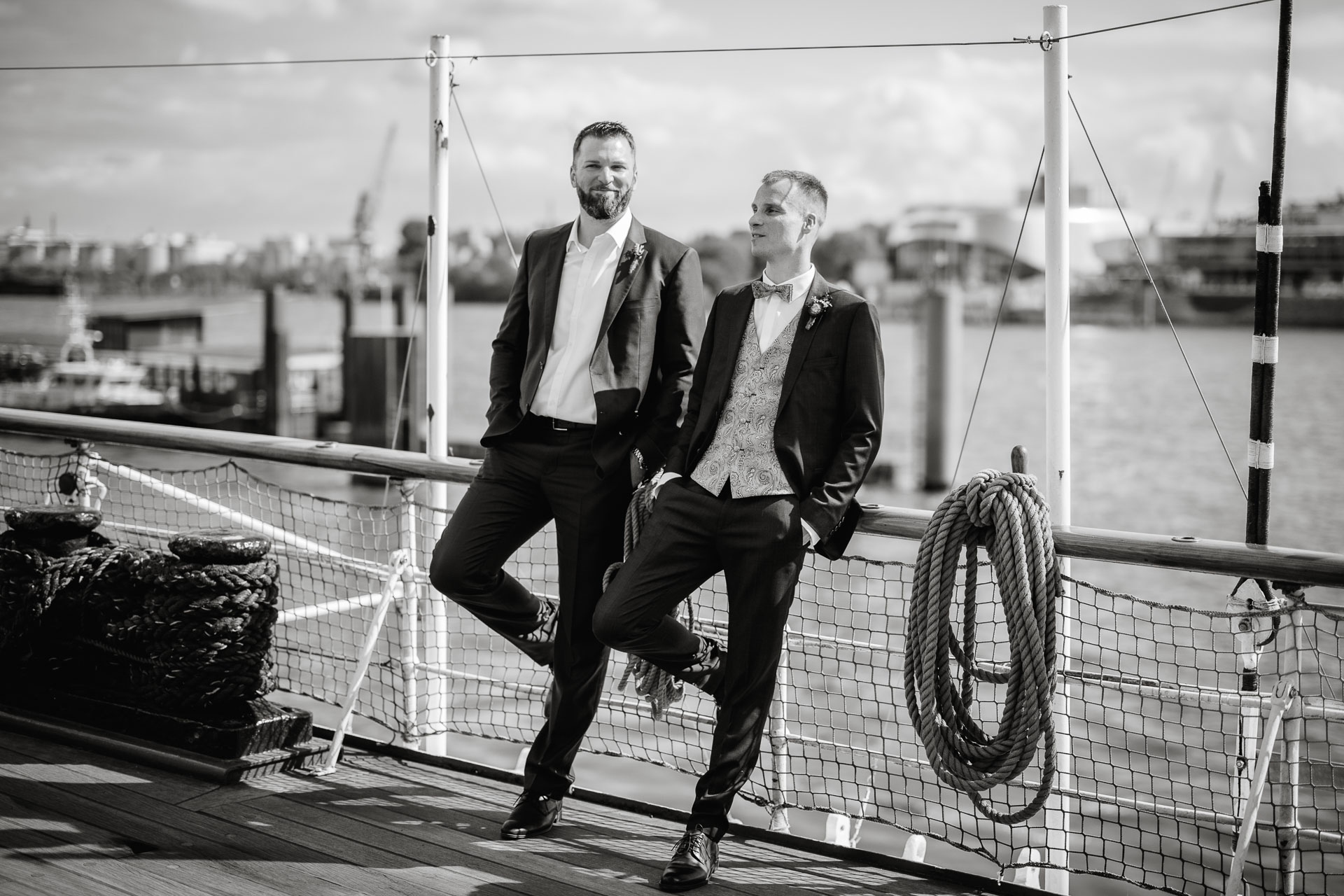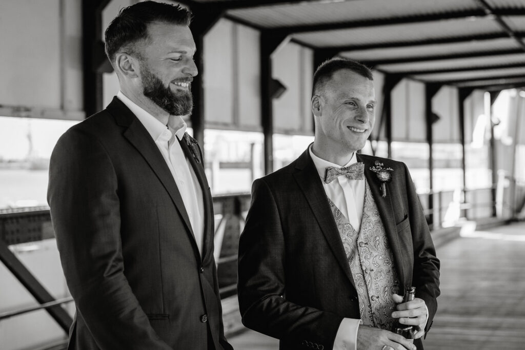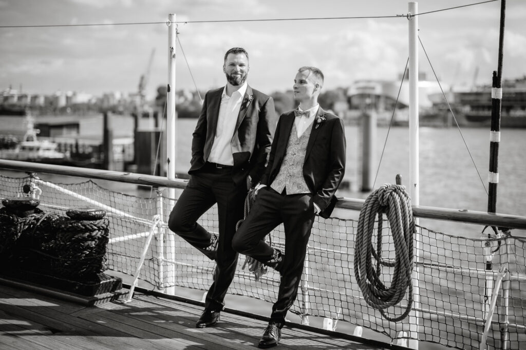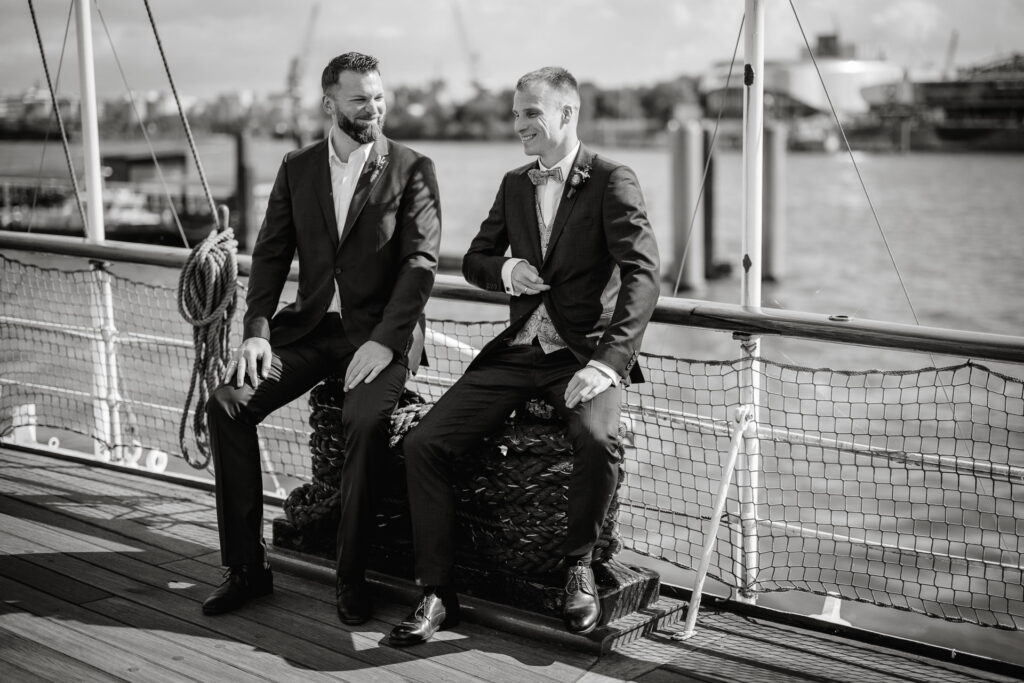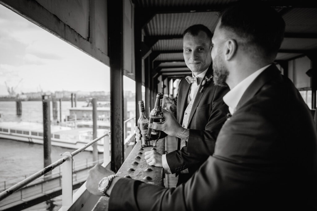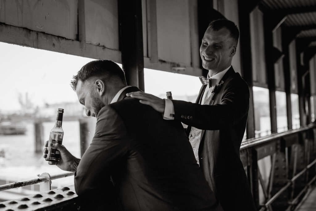 Direkt nach der standesamtlichen Trauung haben wir uns am Hamburger Hafen getroffen. Anna und Sven sind ein Paar, das mit Leichtigkeit durchs Leben geht – humorvoll, ausgelassen und spürbar verbunden. Genau das machte den Tag so besonders: nichts inszeniert, alles echt.