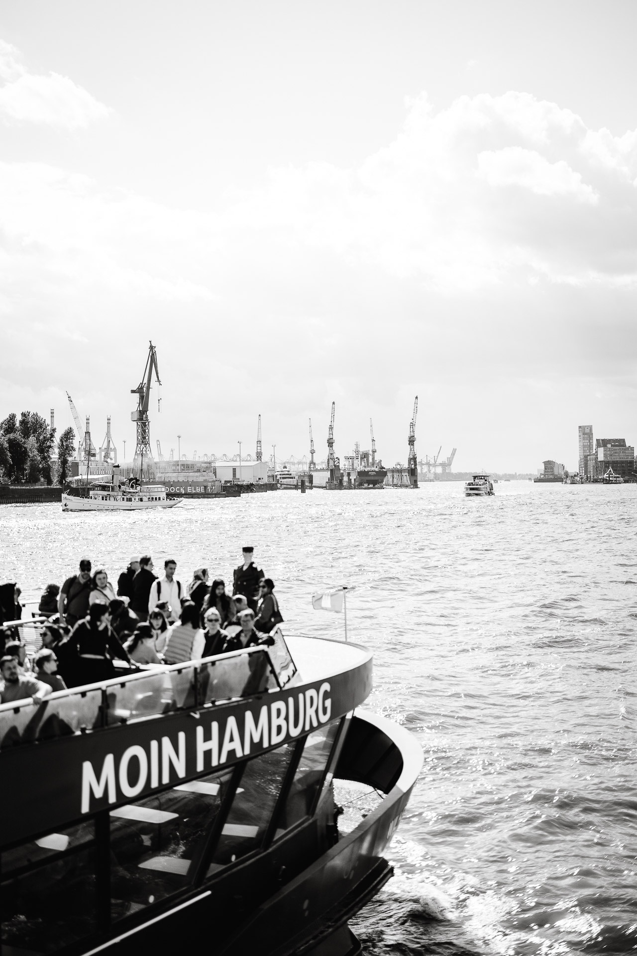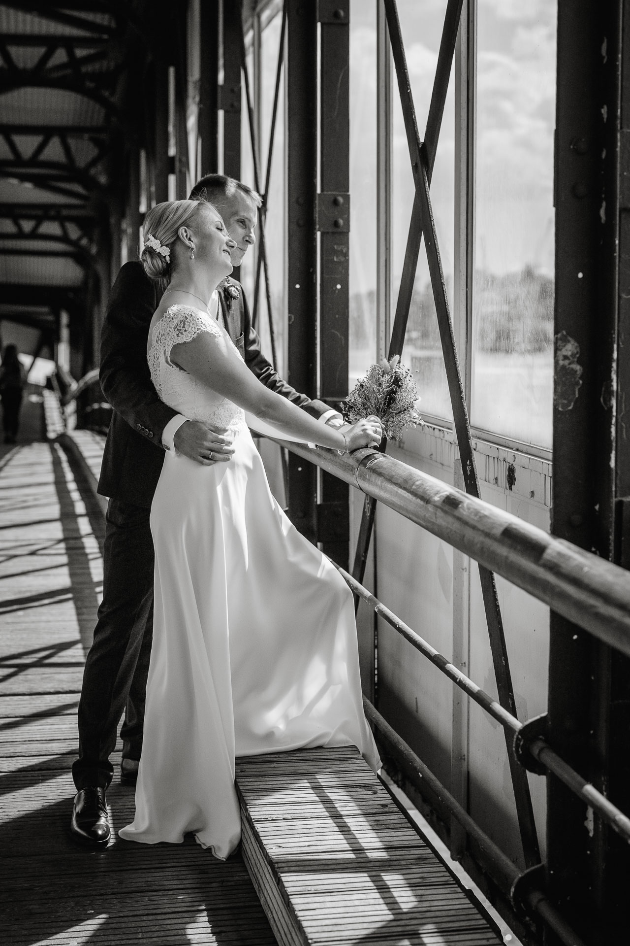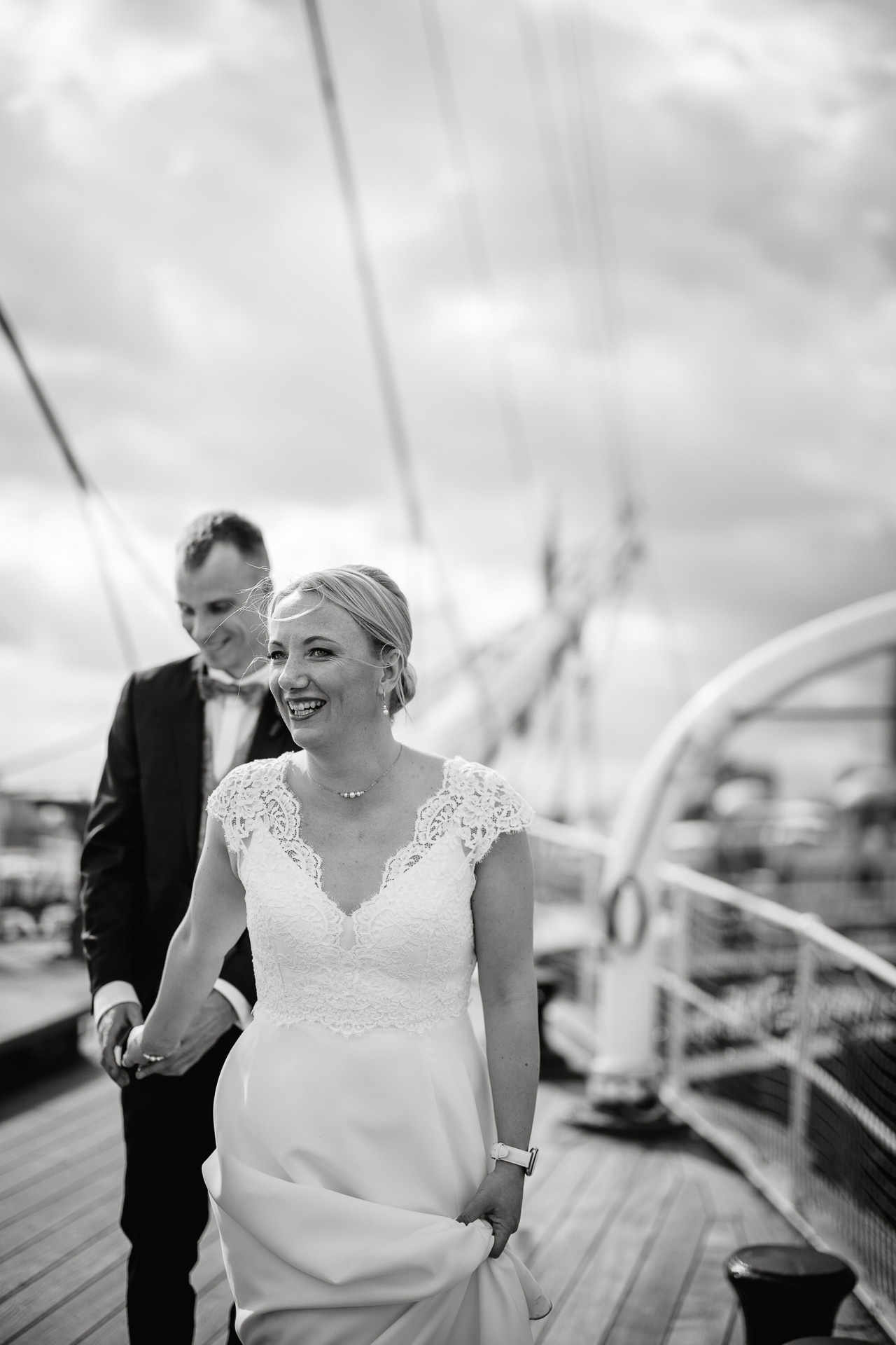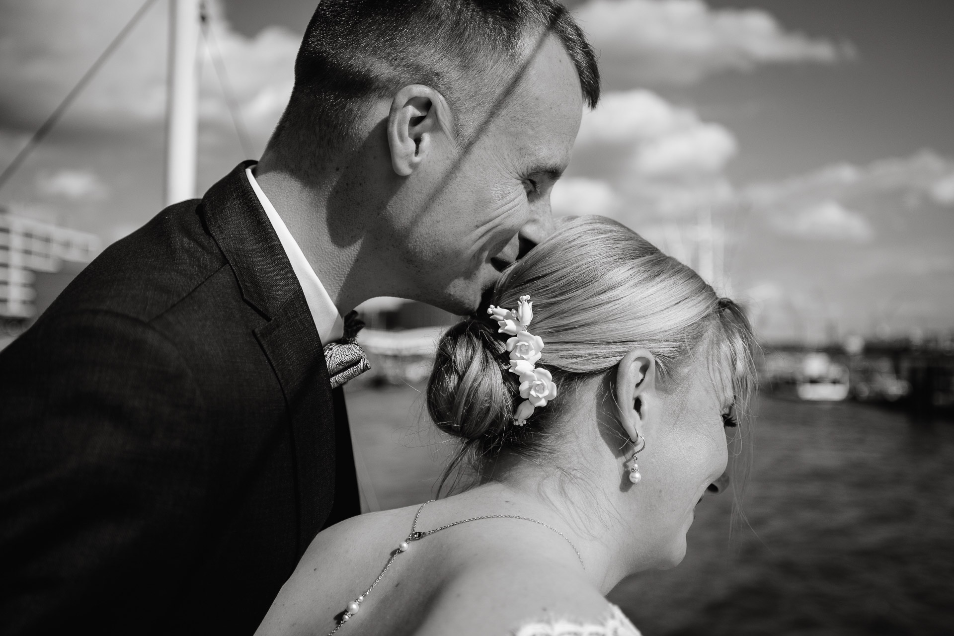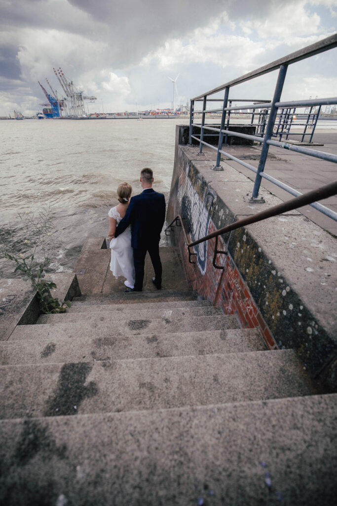 Für ihre Hochzeitsfotos zog es uns natürlich ans Wasser. Der Hamburger Hafen zeigte sich von seiner schönsten Seite: Wolken zogen über die Kräne, Möwen kreisten über der Elbe, und das Licht wechselte zwischen Sonne und Wolken – genau dieses norddeutsche Spiel aus Stimmung und Bewegung, das ich so liebe.
