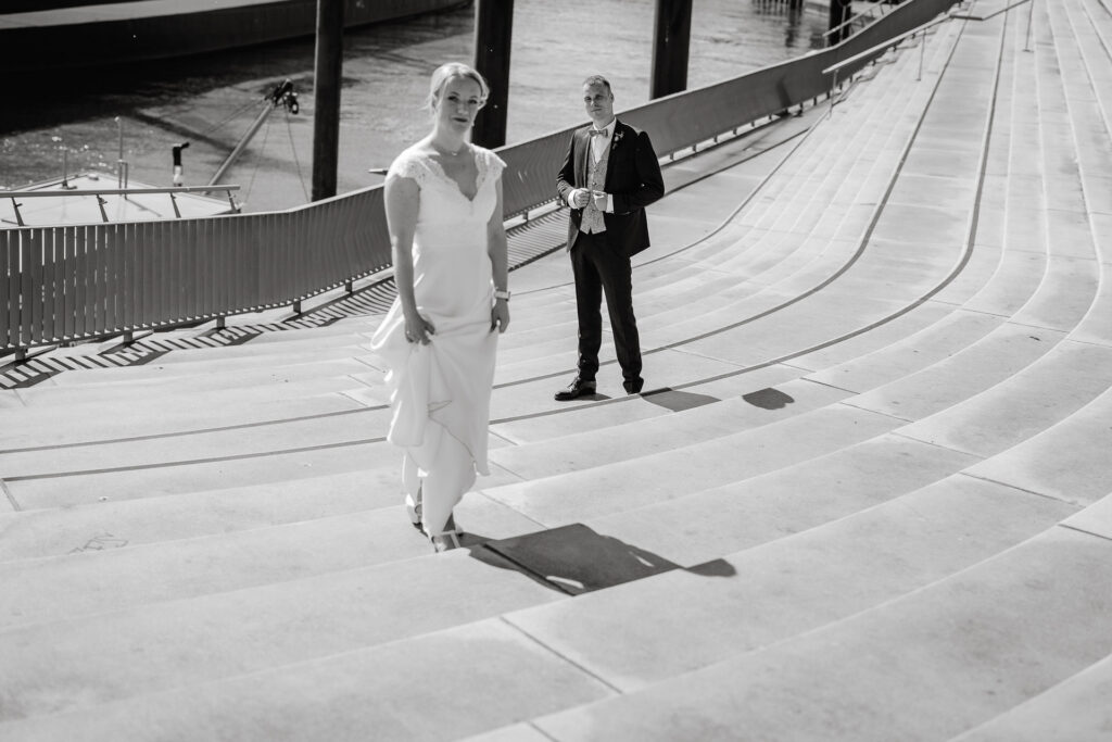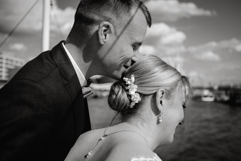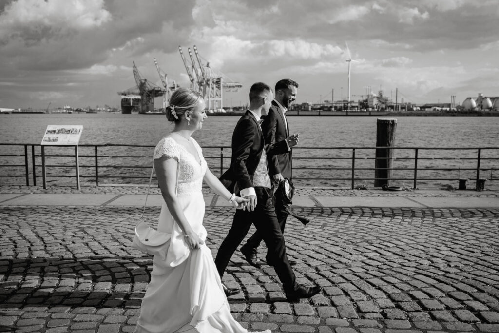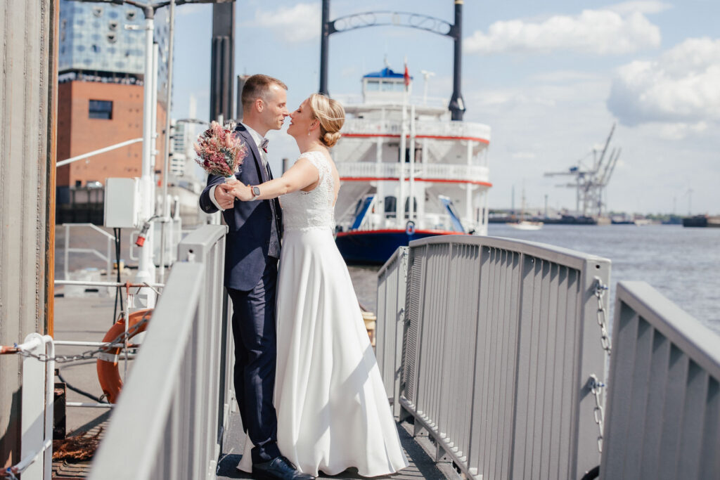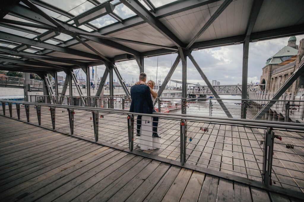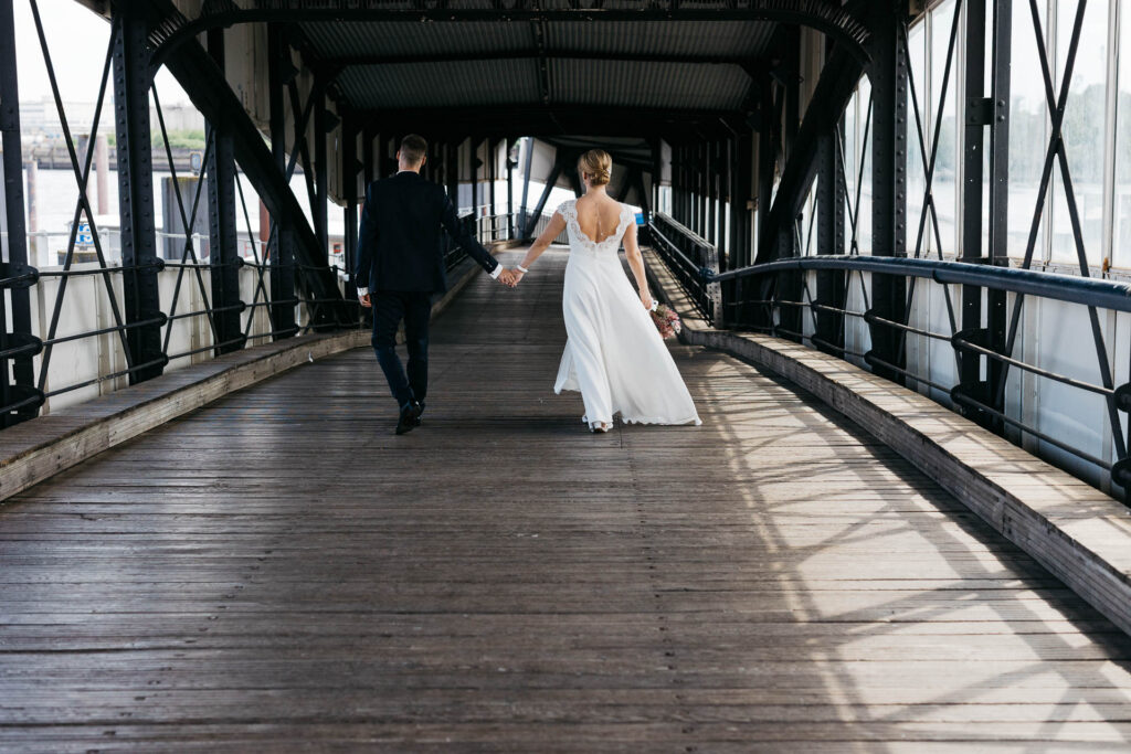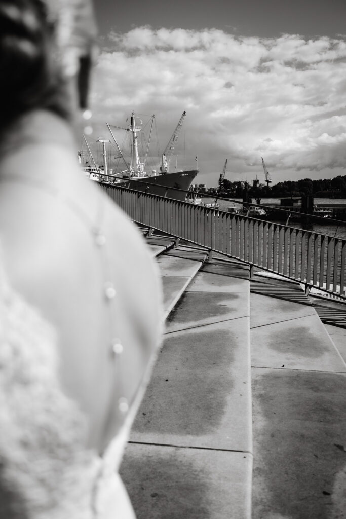 Zum Abschluss des Shootings spazierten wir zu der Location Waterfront. Ihre Liebe zum Hafen und zu Hamburg spiegelt sich in jedem Bild. Für mich war dieser Tag eine Erinnerung daran, warum ich Hochzeiten in meiner Stadt so liebe: weil sie so vielseitig, lebendig und authentisch sind – wie Hamburg selbst. Eigentlich wollten wir noch ganz klassisch ein Hamburger Fischbrötchen an der Landungsbrücke 10 essen, aber die Zeit lief uns doch etwas davon.
