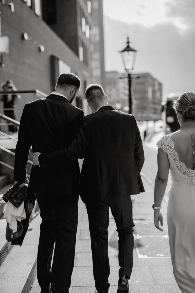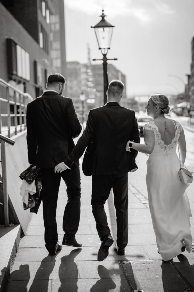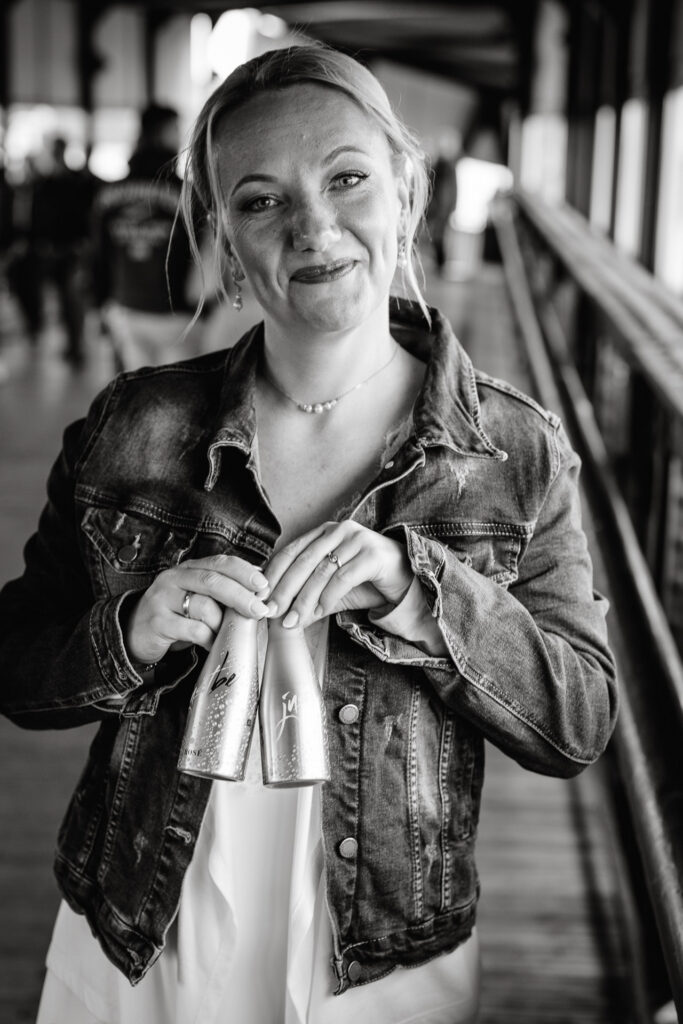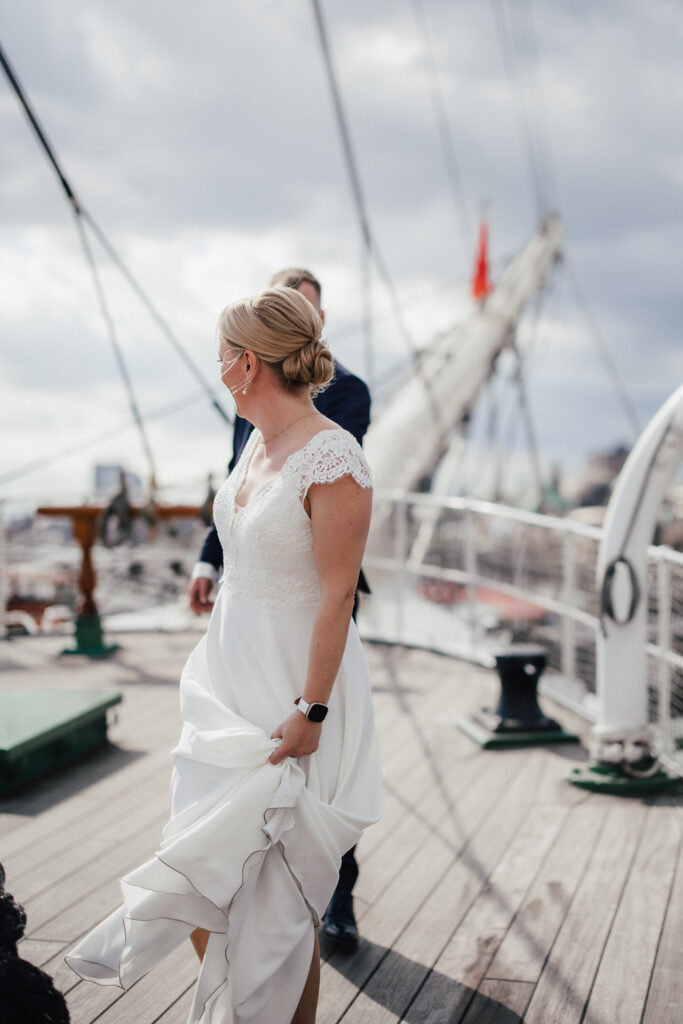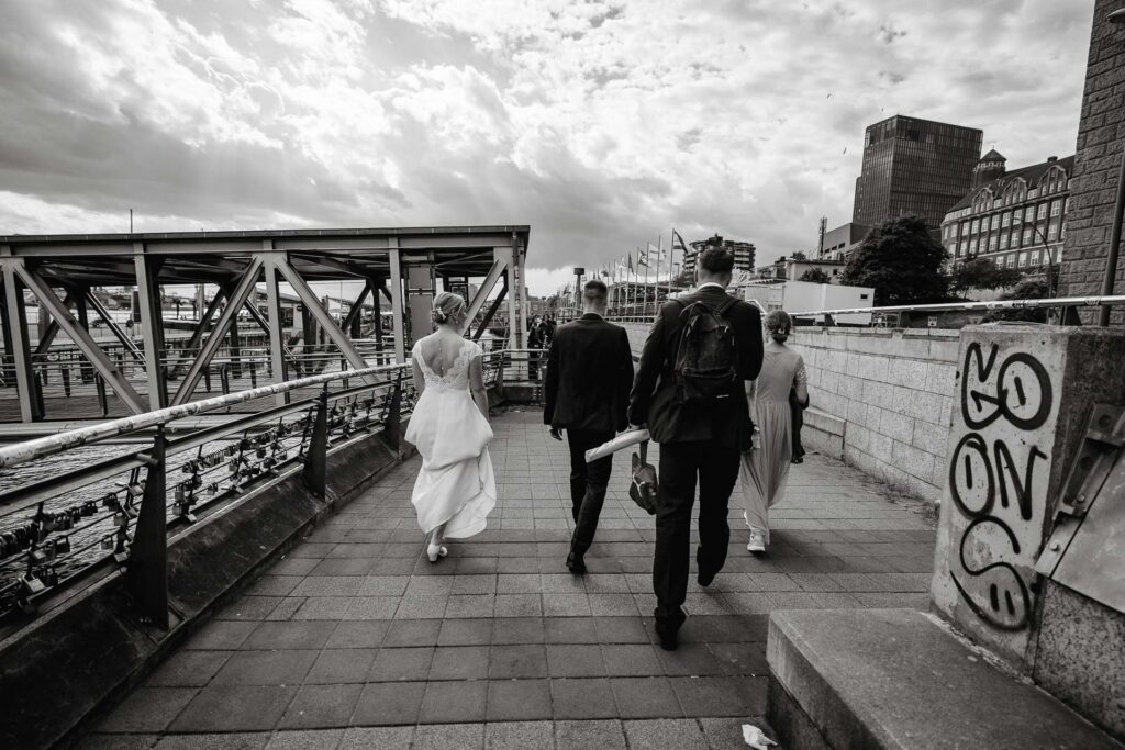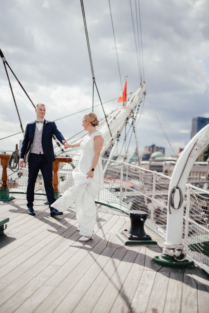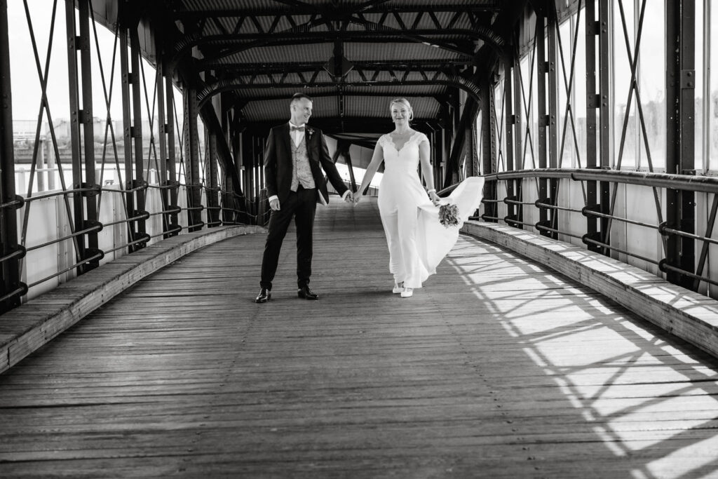 Zum Abschluss des Shootings spazierten wir zu der Location Waterfront. Ihre Liebe zum Hafen und zu Hamburg spiegelt sich in jedem Bild. Für mich war dieser Tag eine Erinnerung daran, warum ich Hochzeiten in meiner Stadt so liebe: weil sie so vielseitig, lebendig und authentisch sind – wie Hamburg selbst. Eigentlich wollten wir noch ganz klassisch ein Hamburger Fischbrötchen an der Landungsbrücke 10 essen, aber die Zeit lief uns doch etwas davon.