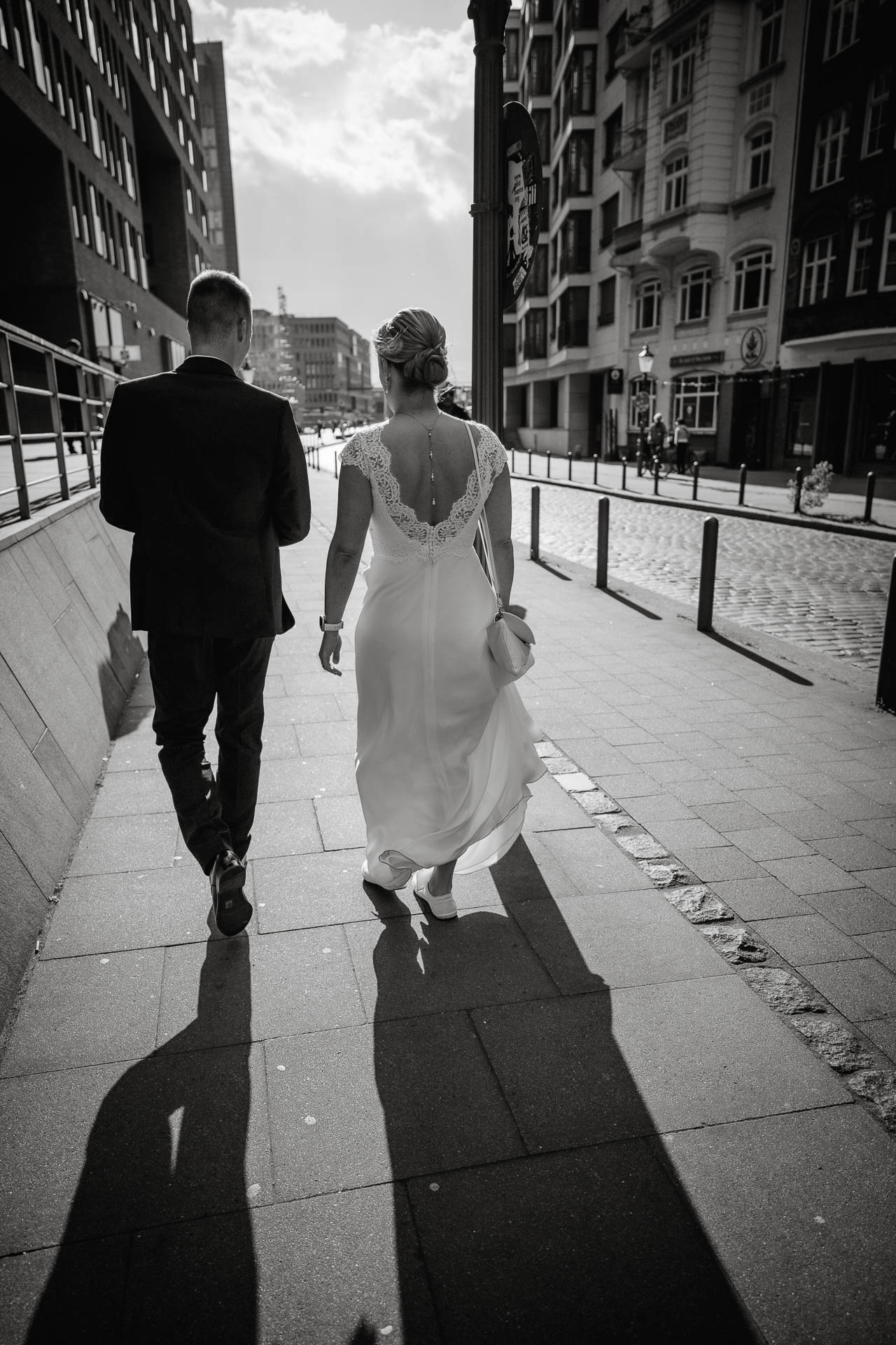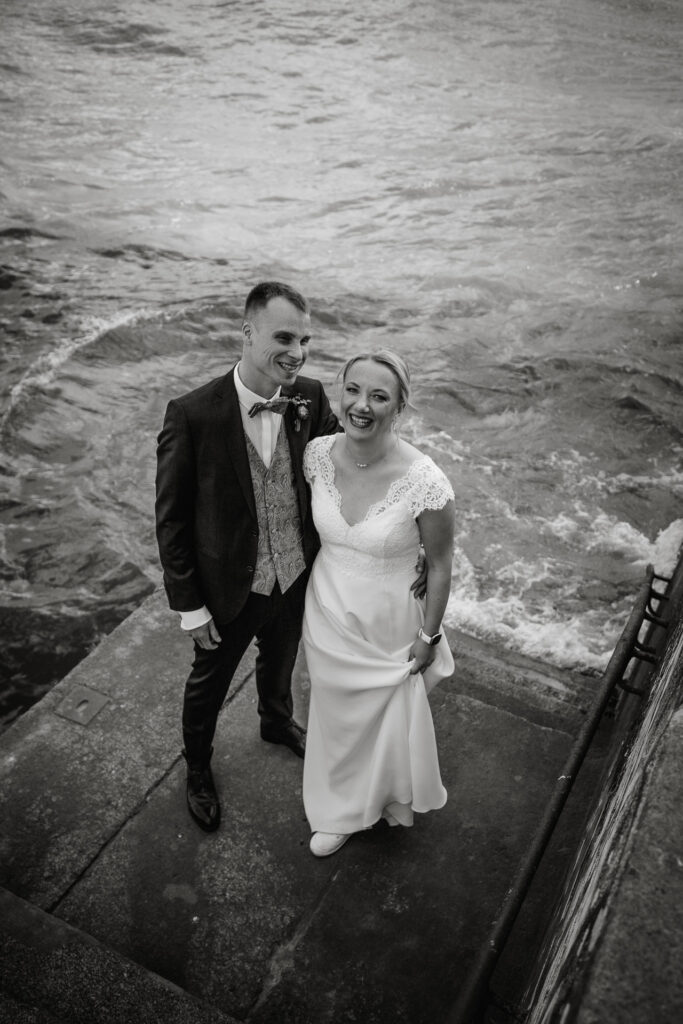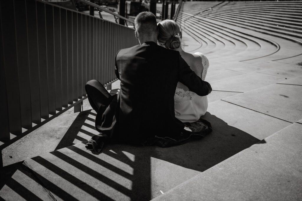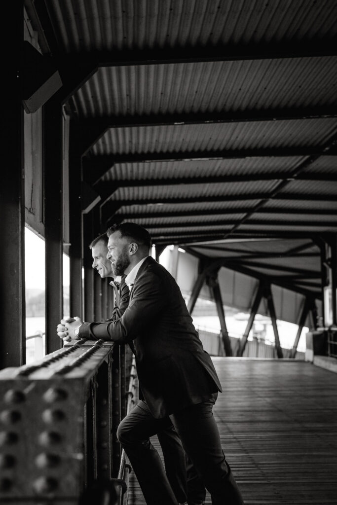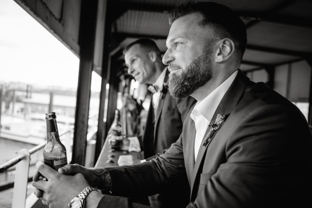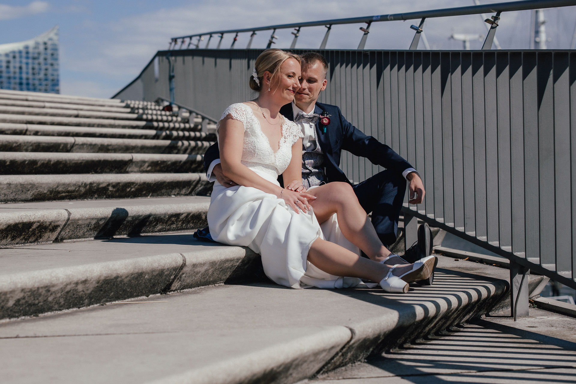 Zum Abschluss des Shootings spazierten wir zu der Location Waterfront. Ihre Liebe zum Hafen und zu Hamburg spiegelt sich in jedem Bild. Für mich war dieser Tag eine Erinnerung daran, warum ich Hochzeiten in meiner Stadt so liebe: weil sie so vielseitig, lebendig und authentisch sind – wie Hamburg selbst. Eigentlich wollten wir noch ganz klassisch ein Hamburger Fischbrötchen an der Landungsbrücke 10 essen, aber die Zeit lief uns doch etwas davon.